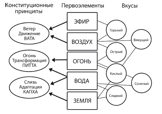 Всё аюрведическое знание базируется на понятии тридоша – трёх основных составляющих физического тела человека: Вата (газ, воздух), Питта (желчь, огонь) и Капха (слизь, вода). Если описать доши одним словом, то Вата – это движение, Питта – трансформация, а Капха – это стабильность. Сочетание дош в организме человека и даёт его индивидуальный конституциональный тип. Вата-доша отвечает за дыхание, сердцебиение и кровоток, деятельность мышц, нервные импульсы, движение межклеточной и внутриклеточной жидкости, поток питательных веществ и отходов, сенсомоторные функции, естественные позывы. Питта-доша – это температура тела, цвет кожи, блеск, пищеварение, усвоение, понимание и восприятие. Капха – принцип включает в себя все ткани, устойчивость, рост, силу и исцеление, а также иммунитет, сопротивляемость, смазку и увлажнение.