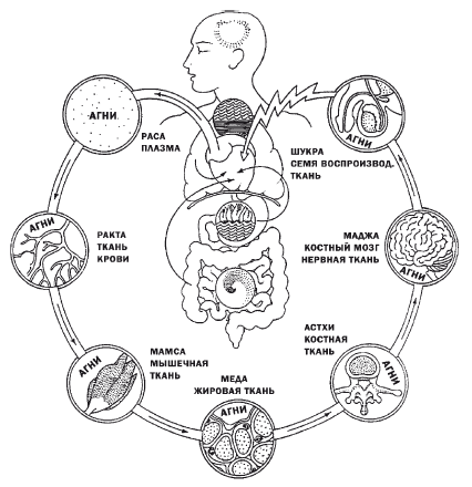 Когда процесс переваривания пищи подошёл к концу, из питательного хилуса начинается формирование тканей организма. Согласно Аюрведе, человеческий организм состоит из семи дхату (тканей).
