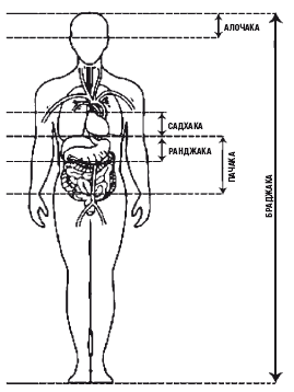 Вата-доша локализуется в теле ниже пупка, включая ноги, Питта – от пупка до груди, Капха – от груди и выше. И у каждой доши есть свои центры, или «дома»: у Ваты – толстый кишечник, Питты – тонкий кишечник и желудок, дом Капхи – лёгкие. Когда доши накапливаются в своих домах без меры, начинается их дисбаланс и они «выходят за границы своих домов». Тут-то и начинаются болячки.