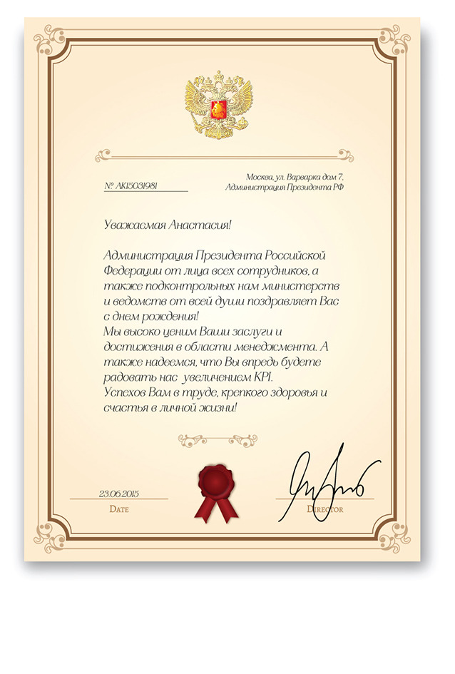 Прежде всего, листок бумаги нужно превратить в бланк администрации президента. Вы видели такие бланки? Ваша жена тоже не видела. Поэтому смело набирайте шапку в левом верхнем углу. Напечатайте с помощью принтера: Москва, ул. Варварка, дом 7, Администрация Президента РФ. Ниже добавьте пустую строку. В ней вы потом напишете от руки номер с двумя буквами для солидности. К примеру – 865 ТС или 319 КЛ. Пока же набирайте текст самого послания.