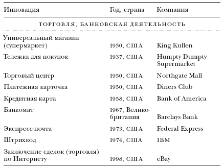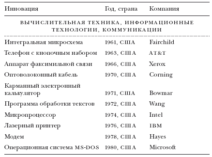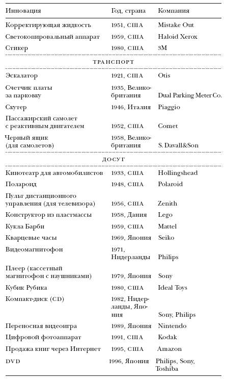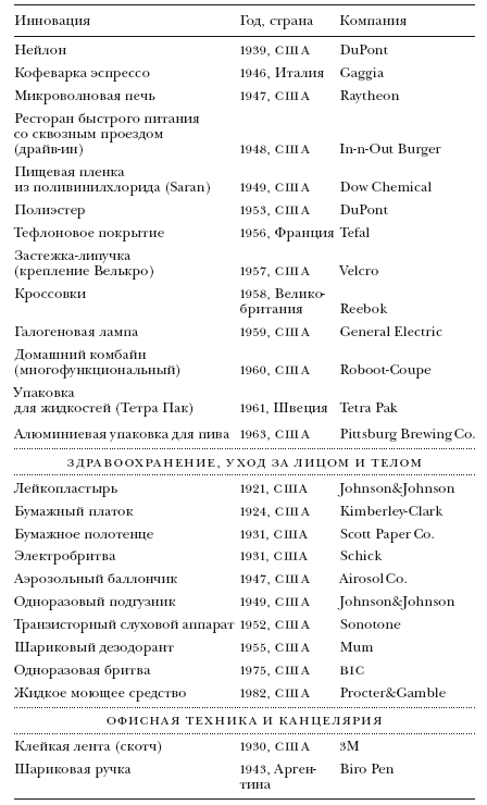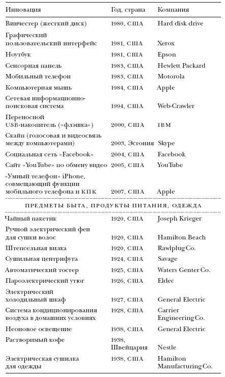 ПРИМЕЧАНИЯ. Мы отобрали перечисленные изобретения, изучив целый ряд различных списков и баз данных. Основным критерием включения в данную таблицу была актуальность объектов и технологий для широких масс населения; речь шла о предметах, хорошо знакомых большинству людей, а не только ограниченному кругу специалистов. Отдельные критерии исключения рассматриваются в тексте: 1) среди изобретений присутствуют лишь инновации, подпадающие под определение Шумпетера; следовательно, в списке отсутствуют разработки, созданные по заказу военно-промышленного комплекса и им профинансированные; 2) мы не стали включать новые продукты и услуги, разработанные в сфере медицины (лекарства, диагностическое оборудование и т. д.), по той простой причине, что нам сложно было бы отобрать самые важные из сотен и тысяч новаторских препаратов и медицинских инструментов (возможно, на дальнейшей стадии исследования можно включить и такой раздел).