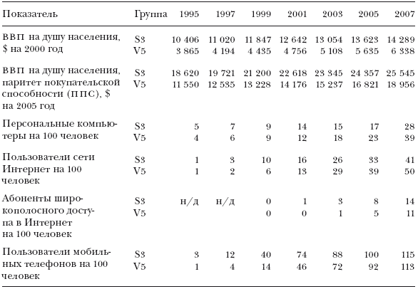 Таблицы 1–6, 1–7 и 1–8 демонстрируют еще несколько результатов не менее важных диффузных процессов в области технологий, это пользование компьютерами и доступ к сети Интернет. Скорость следования за лидерами в этих сферах выросла на глазах.