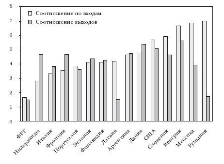 ПРИМЕЧАНИЕ. Соотношение по входам рассчитано как количество новых компаний, разделенное на общее число всех компаний, которые работали на рынке в отдельно взятом году. Соотношение выходов – количество компаний, вышедших с рынка, разделенное на изначальное количество, то есть число компаний на предшествующий год.