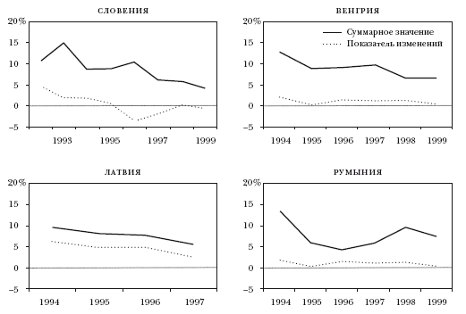 Хорошо структурированные данные позволяют проследить, как шли процессы выхода на рынок и ухода с него в постсоциалистических странах. Бартельсман, Халтивангер и Скарпетта в своей статье (Bartelsman, Haltiwanger, Scarpetta, 2004) предлагают подробный отчет и анализ, основываясь на данных, отражающих процесс созидательного разрушения, для компаний из 24 стран, включая ряд стран с переходной экономикой: Эстонию, Венгрию, Латвию, Румынию и Словению. В качестве иллюстрации приведу лишь одну диаграмму (рис. 1–2), на которой отражены данные по компаниям с минимальным числом сотрудников 20 человек в 1990-е годы.