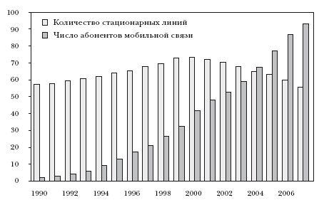 Шумпетеровский процесс созидательного разрушения продолжается, а созидание происходит быстрее разрушения. Выход на рынок и расширение стимулируют мощные силы, в то же время существуют серьезные ограничения на выход с этого рынка. Уже внедрившиеся в данный сектор руками и ногами держатся за место, даже если терпят убытки. По мере массового распространения мобильных телефонов, стационарные линии сворачиваются (рис. II-1), однако происходит это медленными темпами, не сравнимыми с распространением мобильной связи.