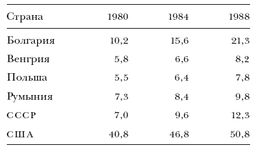 Фиксированные телефонные линии на 100 жителей в ряде социалистических стран и в США, 1980–1988 годы