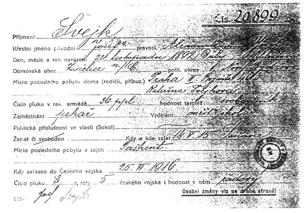 [Закрыть]. Этим документом сразу подтверждались и существование в австрийской армии чешского солдата по имени Йозеф Швейк, и его служба на восточном фронте во время Первой мировой войны, и его пребывание в русском плену (а следовательно, и в лагерях военнопленных), и служба в чехословацких добровольческих частях в России, и участие в битве у Зборова, в которой, между прочим, участвовал и Ярослав Гашек, награжденный за эти бои еще в октябре 1917 года серебряной Георгиевской медалью «За храбрость». Дальше выяснилось, что архив располагал и прекрасной «Картотекой легионеров», состоявшей из их личных дел. Среди них оказалось и дело Швейка – выцветшая и потемневшая от времени, некогда розовато-дымчатая папка, которой еще не касалась рука ни одного исследователя Гашека. А в папке целый набор документов о пребывании Швейка в России: регистрационная карта-анкета, послужные списки Швейка, документы о перемещениях, зачислениях, откомандированиях, медицинских освидетельствованиях. С особым чувством читаешь эти листы (некоторые из них даже не успели пожелтеть) и узнаешь, что в России Швейк ходил по улицам Киева, Ташкента, Самары, Челябинска, Тюмени, Иркутска, Владивостока…