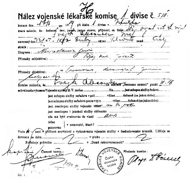 В папке вообще хранился целый набор медицинских документов 1919 года, удостоверявших, что «Александр Юсефович Швейк – как сказано в копии свидетельства о болезни (на русском языке), – “одержим” различными заболеваниями – “резким неврозом сердца”, “упадком питания и малокровием”, головокружениями, сильной тахикардией и “по изложенному увечью, не уступающему лечению”, “признан подлежащим увольнению вовсе со службы как совершенно к ней неспособный. Носить оружие не может. Зачислению в ополчение второго разряда не подлежит. Следовать пешком может. В сопровождающем не нуждается». Трудно сказать, действительно ли Швейк тогда так сильно болел (похоже, что он лежал даже в госпитале) или же, стремясь скорее вернуться на родину, нашел способ преувеличить тяжесть своего состояния. Во всяком случае остается фактом, что потом он прожил еще без малого полсотни лет и скончался, когда ему шел восьмой десяток.