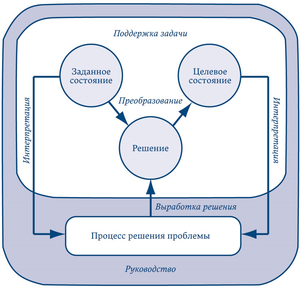 Общая схема решения проблем человеком (Newell & Simon, 1972) помогает провести различие между поддержкой задачи и руководством. Согласно этой схеме, для полного описания работы учащегося над учебной задачей или проблемой необходимы четыре элемента (см. рис. 4.4):