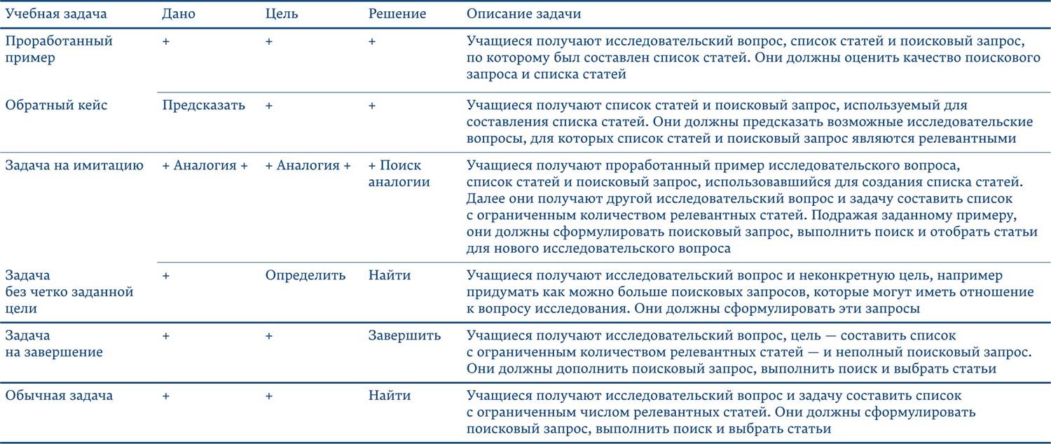 Таблица 4.4. Примеры различных типов учебных задач для сложного навыка «поиск соответствующей научной литературы» расположены в порядке от высокой поддержки задачи (проработанный пример) до отсутствия поддержки задачи (обычная задача). Знак плюс в колонках «Дано», «Цель» и «Решение» означает то, что предоставляется учащемуся, а описание «предсказать», «определить» и т. п. означает действие, требуемое со стороны учащегося