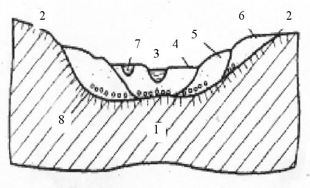 9.10-rasm. Daryo vodiysi tuzilishining elementlari: 1– tub jinslar; 2-yonbag‘ir; 3-o‘zan; 4-poyma-qayir; 5– poyma ustidagi birinchi terrasa; 6– poyma ustidagi ikkinchi terrasa; 7– eski o‘zan; 8– vodiy tubi.