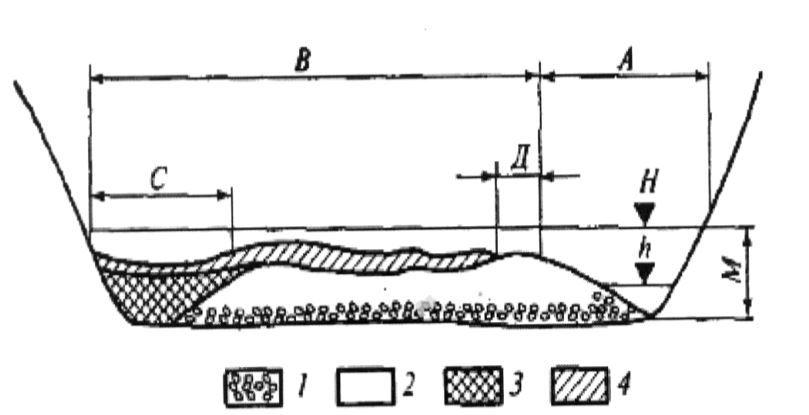 9.11-rasm. Poymaning tuzilish sxemasi (E.V. Shanser bo‘yicha): A– o‘zan; V-poyma; S-qadimgi o‘zan; D– o‘zan oldidagi ko‘tarilma; N– suvning ko‘tarilgan sathi; h-suvning pasaygan sathi; M-allyuvial yotqiziqlarning mo‘tadil qalinligi (o‘zan allyuviysi); 1– yirik donador qum, graviy, shag‘al; 2– mayda va mayin zarrali qum; qadimgi allyuviy; 3-torf; poyma allyuviysi; 4– suglinok.