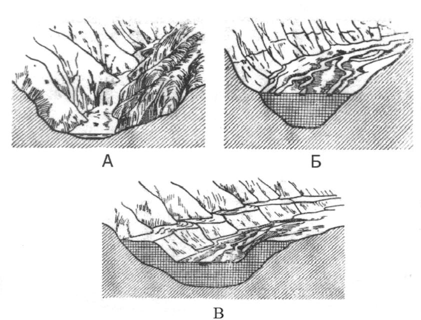 9.12-rasm. Daryo bo‘yi vodiysining rivojlanish holati aksi va poyma usti qavatlarining hosil bo‘lishi: A-birinchi bosqich; B– ikkinchi bosqich; D– uchinchi bosqich.
