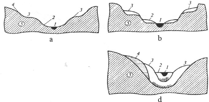 9.13-rasm. Poymausti terrasalari tipi: a– erozion; b-sokolli; d– akkumulyativ; 1– o‘zan; 2-poyma; 3-poyma ustidagi birinchi terrasa; 4-poyma ustidagi ikkinchi terrasa; 5-tub jinslar.