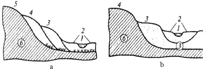9.14-rasm. Poymausti allyuvial terrasalarining ko‘rinishi: a-tub jinslar ustida hosil bo‘lgan; b– o‘yilishdan hosil bo‘lgan; 1-o‘zan; 2– poyma; 3-5-poyma ustidagi terrasalar; 6– tub jinslar.
