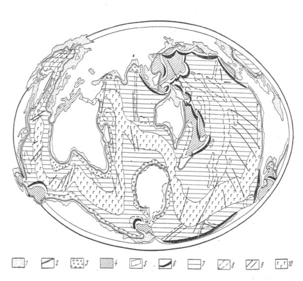 10.2 -rasm. Dunyo okeani tubi relyefi tuzilishining asosiy elementlari (O.К.Leontev bo‘yicha): 1-shelf; 2-materik yonbag‘ri; 3– materik etagi; 4-dengiz o‘rtalig‘i va chekkadagi cho‘kmalari; 5-orollar yoyi; 6-chuqur suv novlari; 7-okean tubi; 8-okean tubi ko‘tarilmalari va tog‘lari; 9-okean o‘rtaliq tog‘ tizmalari; 10-yirik yoriqlar.