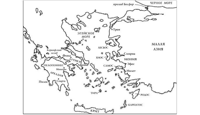 К этому времени греческие города объединились в три отчетливые группы. Микенские города на материке триста лет тому назад подверглись набегу прибывающих дорийцев, но они не исчезли полностью. Выжившие остатки микенской цивилизации располагались в области, известной как Аркадия. Она располагалась в центре южной части Греческого полуострова, Пелопоннеса, ниже залива, который врезался в полуостров с восточной стороны, почти разделяя его надвое, – позднее он станет известен как Коринфиакос Колпос, Коринфский залив.