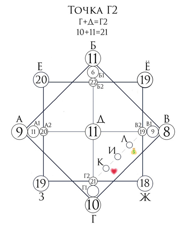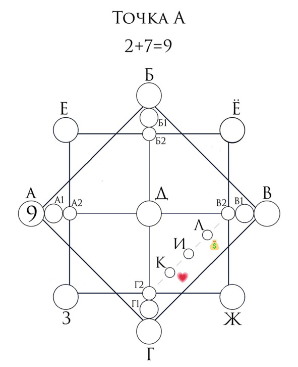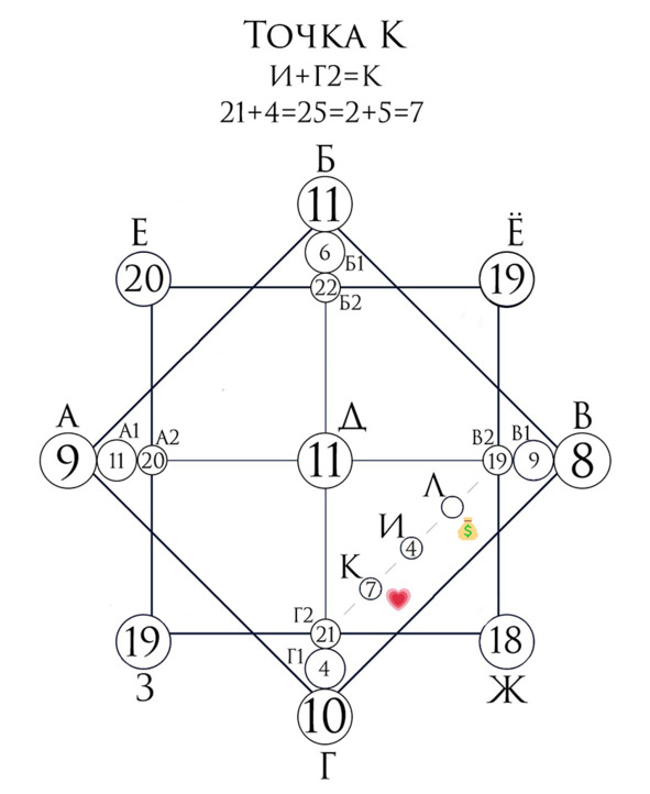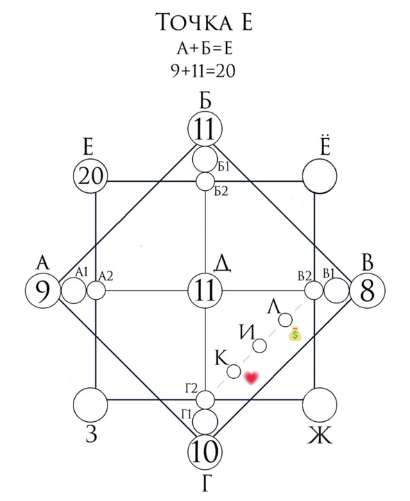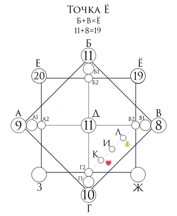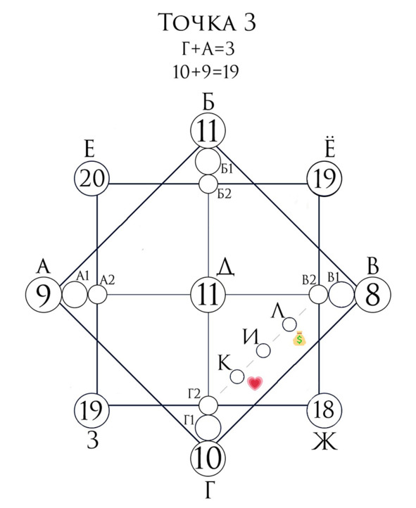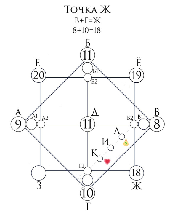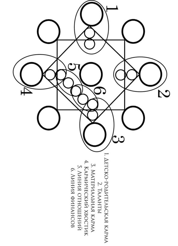 Линия финансов (на рис. номер 6) начинается из точки материальной кармы, а заканчивается слиянием с точкой отношений.