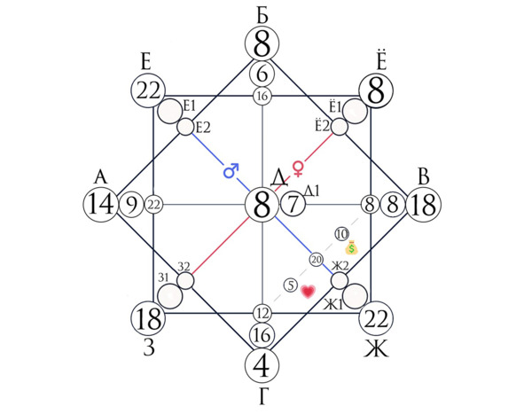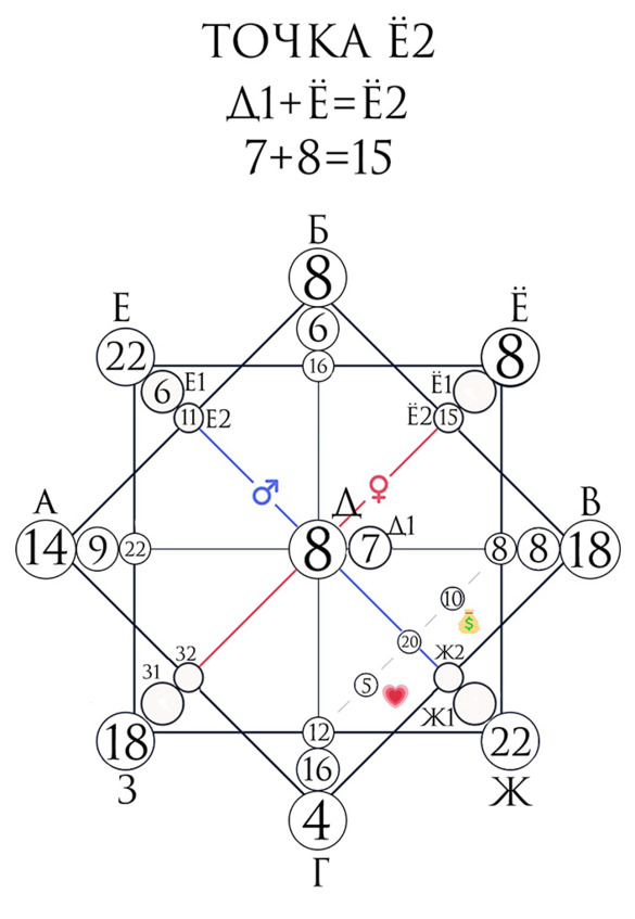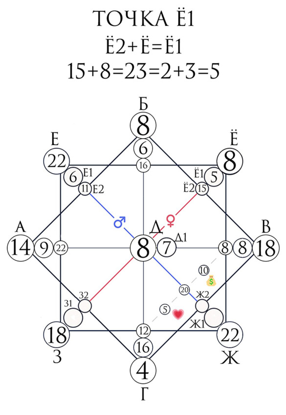 Точки Ё1 и Ё2 являются дополнительными и дораскрывают главную точку. Они указывают нам на то, что могли совершить женщины в роду, что к нам это пришло на отработку или пришло как талант.