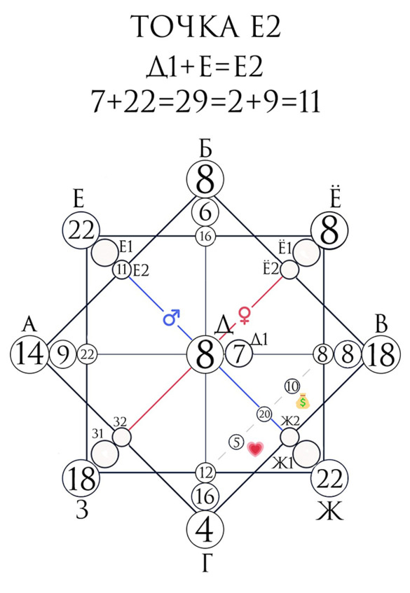 Точки Е1 и Е2 являются дополнительными и дораскрывают главную точку. Они указывают нам на то, что могли совершить мужчины в роду, что к нам пришло на отработку или пришло как талант.