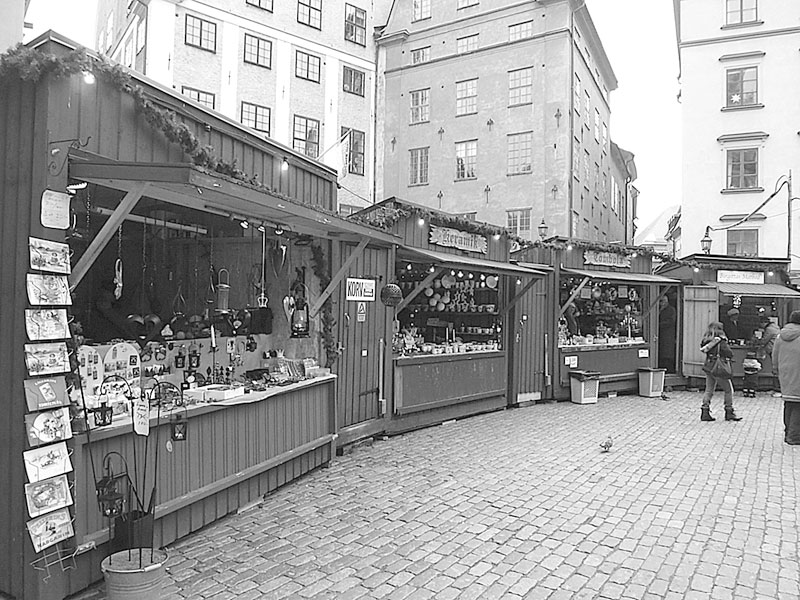 Самой первой площадью Стокгольма (а, возможно, и всей Швеции), заложенной, вероятно, уже в XIII столетии, стала торговая Большая площадь Стурторьйет, вокруг которой сразу появились деревянные лотки, сохранявшиеся вплоть до 1489 г. Кстати, в ноябре – декабре здесь по-прежнему можно ощутить атмосферу старины, когда десятки выкрашенных в красный цвет будочек распахивают свои окошки, чтобы предложить всем желающим соленья, варенья, поделки и сувениры в шумное время рождественских распродаж.
