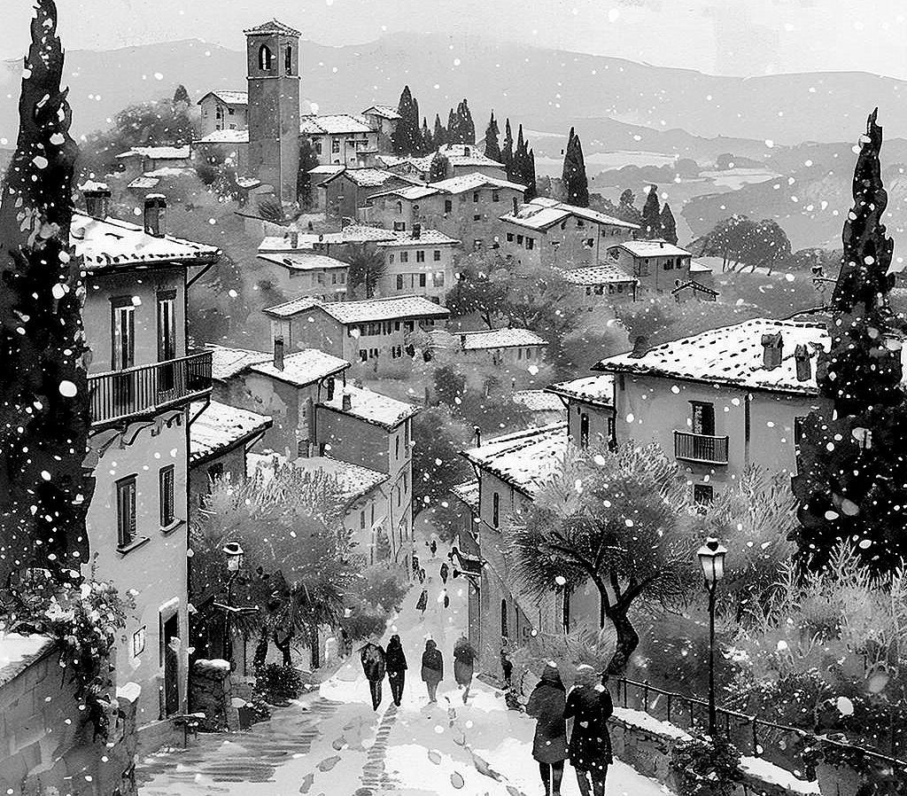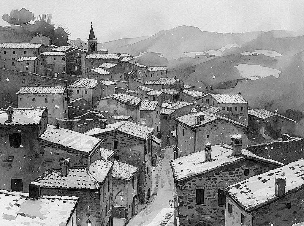Деревня за окном погрузилась в зимнюю сказку. Снег падал так быстро и так мелко, словно небеса тоже готовили новогодний торт и щедро присыпали сахарной пудрой горы, крыши, каменные ступени, потрескавшиеся от времени.