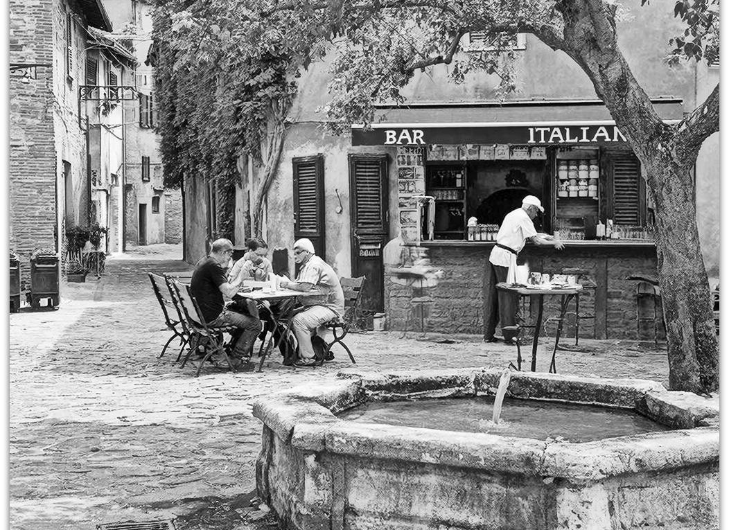 А потом все замирает до нового утра, когда художник и мясник встречаются на улице и направляются в бар на центральной площади. Продолжая спор о правильном уходе за оливковыми деревьями во время этой необычной засухи, они раскачиваются, как старые деревья, чтобы освободить место у стойки. Аромат кофе смешивается с сияющим утром. Потом следующая пара или тройка жителей деревни встречается на улице и неспеша идет в сторону бара.