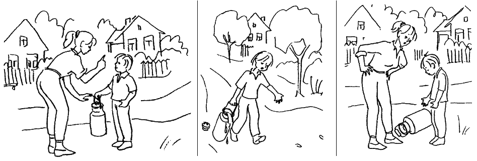Мама отправляет четырехлетнего мальчика за молоком. Надо пройти несколько домов, деревенская улица неровная, под горку. Бидон велик для мальчика, достает почти до земли. Но мама, воспитывая в нем «взрослость» и ответственность, строго предупреждает: «Смотри, не пролей!». Мальчик возвращается в унынии, волоча по земле почти пустой бидон. Мама в ярости.
