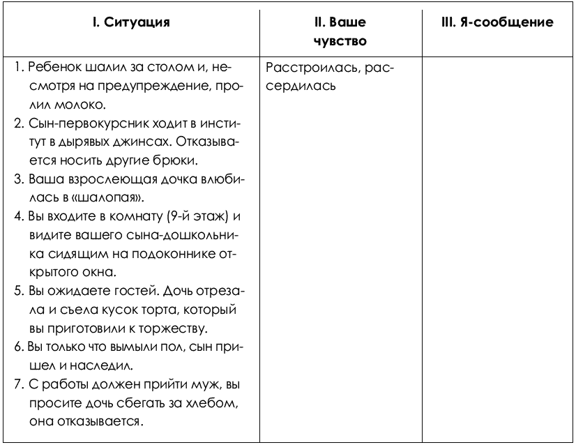 А теперь, имея в виду то чувство (или чувства), которые вы записали против каждой ситуации, напишите в столбце III ваше «Я-сообщение».