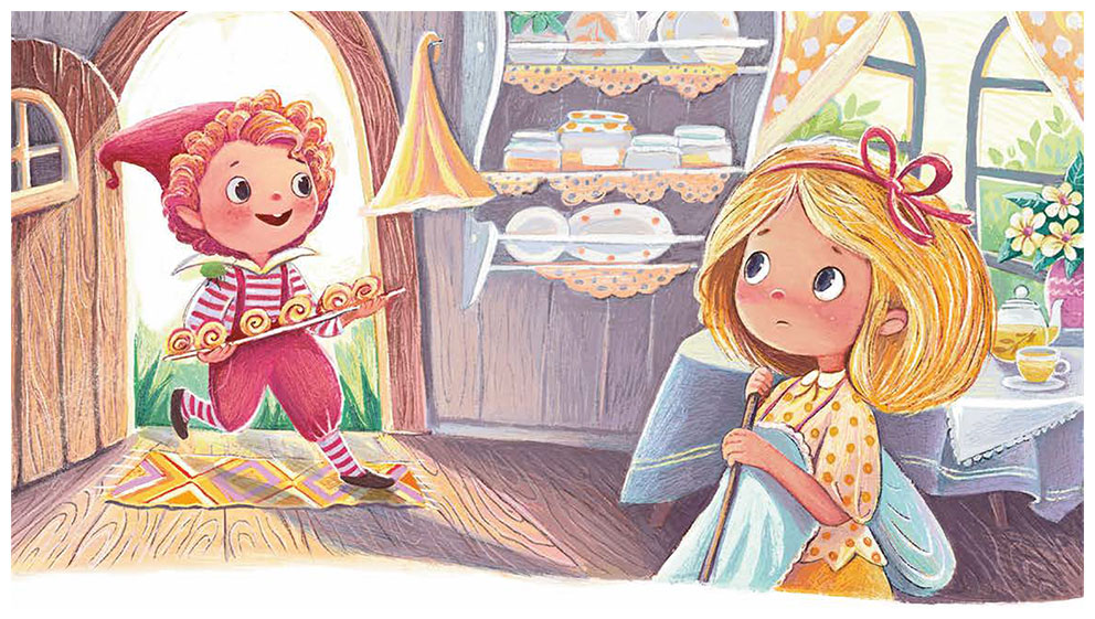 К обеду ароматные рулетики были готовы. Малик сложил их на поднос из дубовой коры и решил отнести соседке. А по соседству с ним жила фея жёлтой малины Желтунья.