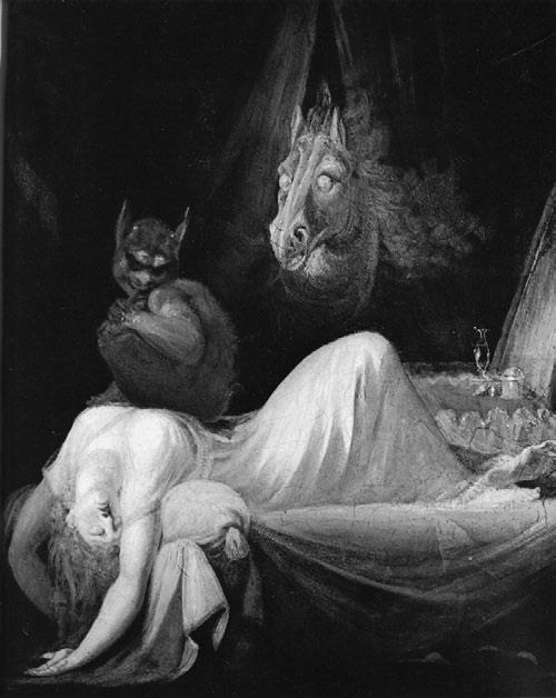 Материализация страшных сновидений в виде инкуба (здесь – подобие сатира) и слепой лошади блистательно воплощена в серии из четырех картин Иоганна Генриха Фюссли «Ночной кошмар». Репродукция одной из них висела в приемной Зигмунда Фрейда. Римейки этого сюжета – на полотнах Николая Абрахама Абильгора «Ночной кошмар» (1794), Чарлза Уолкера «Инкуб» (1870). Символический смысл этого жуткого сюжета, согласно одной из трактовок, задан каламбуром английских слов «night mare» (ночная кобыла) и «nightmare» (кошмар).
