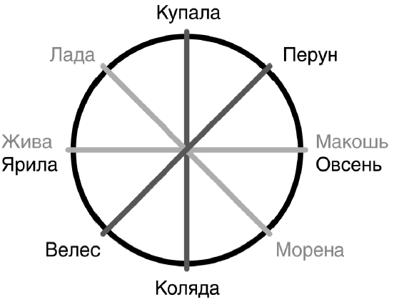 Основные (старшие) боги пантеона символизируются одной из спиц Кола (или одним из лепестков, если мы рассматриваем крест-цветок, без круга). Для территорий условной Московии (то есть для нашей ландшафтно-климатической зоны) это будет выглядеть примерно вот так:
