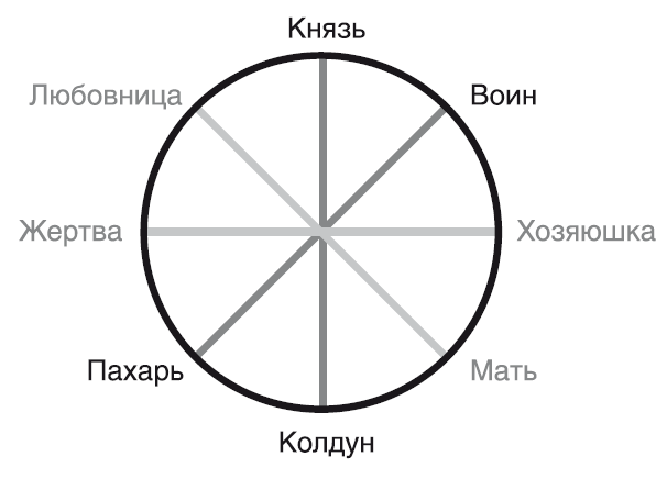 Разные стихийные (климатические) условия – разные боги, разные методы адаптации людей к окружающей среде – и, соответственно, разные национальные характеры и архетипы. Колесо Сварога, трансформируясь в колесо архетипов, будет выглядеть вот так: