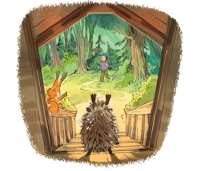 Быстро перебирая лапками, Лаврик помчался встречать хозяина леса. Поскольку Бору на пути постоянно приходилось увёртываться от шишек, да к тому же он то и дело сбивался с маршрута, неудивительно, что ёжик добрался первым. Он распахнул дверь дома своего деда и встал на пороге, подняв передние лапки, будто держал в них тяжёлый мяч.