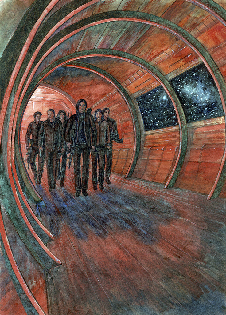 Топот ног впереди по коридору приводит меня в среднюю часть корабля между двумя выходами. Ворота плотно закрыты, а вот один из иллюминаторов в потолке аккуратно вырезан и к нему присосалась герметичная труба с лестницей, по которой, очевидно, можно попасть на муданжский корабль. Его яркое брюхо видно через соседние иллюминаторы: подобно гигантскому жуку он сидит на нашем звездолёте, обхватив длинными суставчатыми лапками нашу «гантелю» за перемычку посередине.