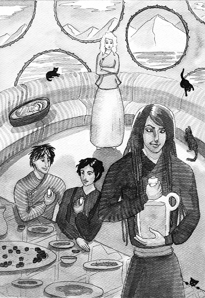Азамат подвешивает по правую руку от себя над кухонным диванчиком люльку и укладывает туда мелкого. Ирлик, отсмеявшись, откупоривает бутылку, Тирбиш достаёт невообразимо красивые крошечные хризолитовые пиалушки, и Ирлик своей рукой их всем наполняет.