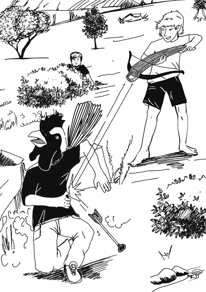 На него надели маску, а вместо плаща повязали на спину красный передник, который взяли с кухни. Для Яшки нашлась новогодняя маска петуха, а для полного сходства долго прилаживали вместо петушиного хвоста веник. Тёма надел маску для подводного плавания и надувной спасательный круг. Парни решили, что каждый по очереди будет охотиться с арбалетом на товарищей, а когда подстрелит обоих, оружие переходит в руки следующего участника. Вот теперь всё было готово к весёлой игре. Первым водил Артём. Он выждал оговорённую минуту, чтобы ребята смогли спрятаться, и с арбалетом в руках отправился на первую охоту. Найти Яшку оказалось совсем нетрудно – он прятался между камнями альпийской горки, причём совсем не подумал, что его хвост-веник торчит над камнями. Тёма прицелился и нажал на спусковой крючок. Стрела, выброшенная тугой тетивой, с лёгким свистом умчалась к цели. Арбалет бил без промаха, и присоска звонко шлёпнула Яшку в левый бок. Он взвизгнул и вышел из укрытия.