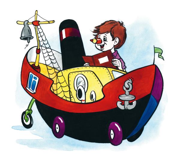 Это был совсем как настоящий пароход, но только сухопутный, пароход на резиновых колёсах, чтобы двигаться по всему классу. На мачте парохода висел звонок с длинной верёвкой. Под ним появился капитанский мостик с медными сверкающими поручнями, а рядом – белая пароходная труба.