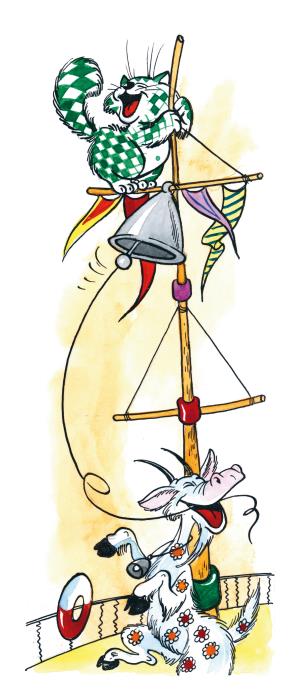 На мостике парохода стояла коза и отчаянно дёргала за вёревку, привязанную к сигнальному колоколу. На шее у неё висел маленький серебряный бубенчик. Он тоже звенел.