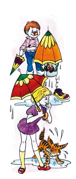 Художник нарисовал мохнатые полотенца, новую сухую одежду, ботинки. А ребята прыгали, смеялись, как будто это был не дождик, а радостный праздник.