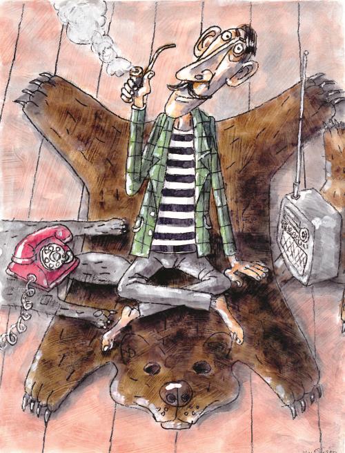 Я вошел и увидел писателя-путешественника. Он сидел на полу, на медвежьей шкуре, и курил кривую трубку. По левую руку от него на шкуре росомахи стоял радиоприемник «Телефункен». По правую, на шкуре волка, – красный телефон.