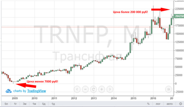 Хочу привести в пример такую компанию, как Транснефть. В начале своей карьеры трейдера я покупал-продавал ее бумаги. В кризис 2008-го цена одной акции опускалась ниже 7000 рублей. Сейчас 2017 год, и цена на рынке почти 200 000 рублей! Как вам такой рост? Если бы вы вложили сумму в размере 14 000 рублей, то через 9 лет у вас было бы 400 000 рублей. А если бы вы вложили 100 000 рублей? Или, к примеру, у вас был бы миллион рублей? Во сколько раз вы бы увеличили свой капитал? У вас сейчас уже было бы почти 30 млн рублей! Эта сумма вас возбуждает?!