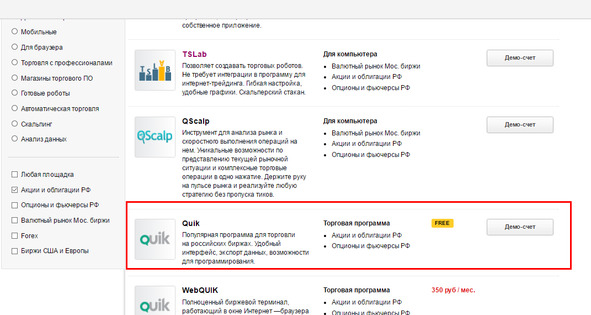 Спускаемся ниже и выбираем программу QUIK, демосчет.