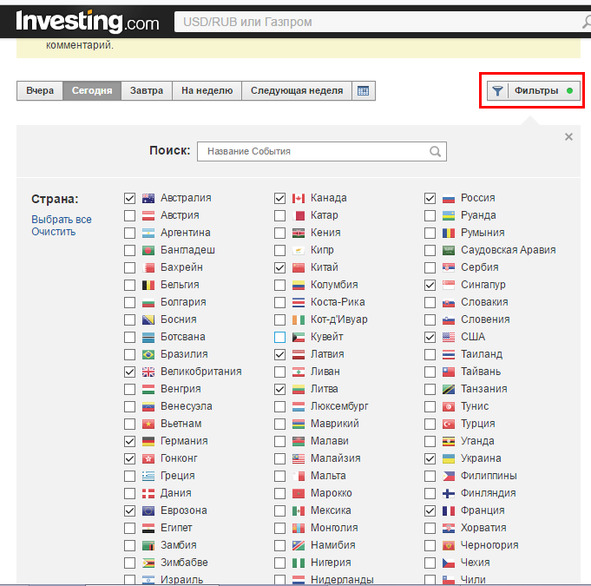 А нажав на фильтр, мы получаем выпадающий список, в котором можно поставить галочки напротив стран, по которым для нас будет важно видеть все новости.