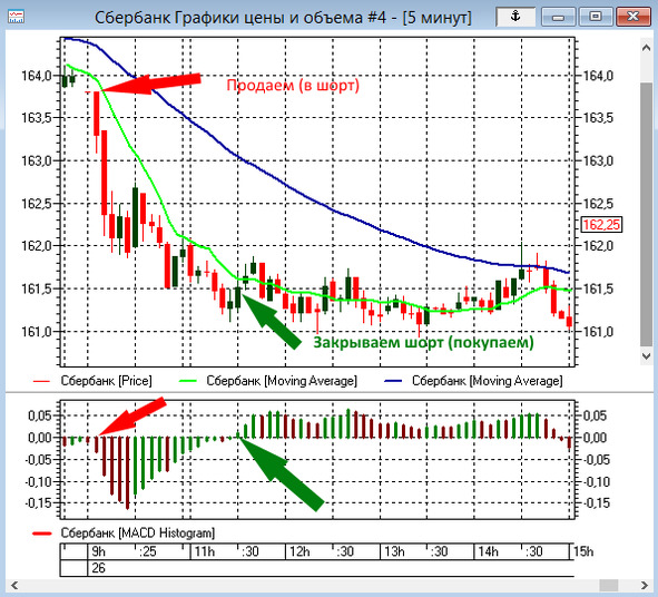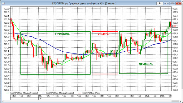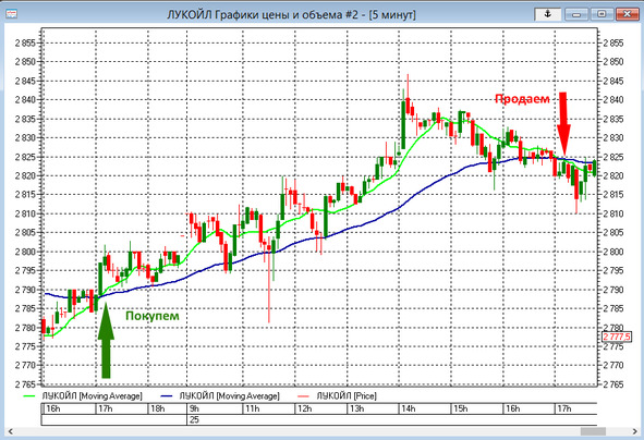 При пересечении двух скользящих мы получаем сигнал на вход или выход из рынка. Хороший сигнал на покупку или продажу возникает при появлении сильного тренда.