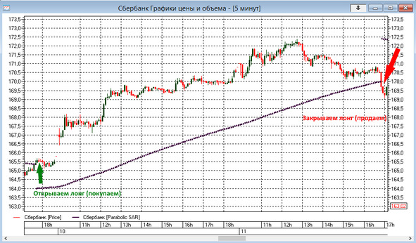 Этот индикатор очень хорошо показывает восходящий или нисходящий тренд. Обычно на графиках его изображают в виде жирных точек, и если эти точки располагаются над ценой – то тренд падающий, если под ценой – то тренд растущий.