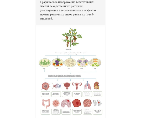 Атранорин, каператиновая, физодовая, скваматовая, салазиновая и леканоровая кислоты способны преодолевать гематоэнцефалический барьер и оказывать цитотоксическое действие на линии раковых клеток. α-пинен и D-лимонен Фенхеля – для лечения рака молочной железы. Антоцианы дикой Черешни Prunus avium имеют усиленные химиопрофилактические свойства. Несколько исследований показали, что многие флавоноиды, в том числе лютеолин (Grayer et al., 2003) и апигенин (Simões et al., 2010), ингибируют пролиферацию различных нормальных и опухолевых клеток, происходящих практически из всех тканей (Packer et al., 2004). Физиологические дозы таких биоактивных веществ, как ацетат, пропионат и бутират подавляют рост и пролиферацию ректальных опухолевых клеток. Например, Хризантема вида Chrysanthemum morifolium повышает их уровень в кишечнике. Берберин ингибирует пролиферацию клеток и запускает клеточный апоптоз клеток рака предстательной железы, а также может ингибировать возникновение и прогрессирование многих видов рака. Ряд каротиноидов ингибирует рост опухолевых клеток, возможно, посредством ингибирования ангиогенеза, стимуляции апоптоза и удаления свободных радикалов (Milani et al., 2017). Биовитамин никотинамид помогает иммунным клеткам бороться со злокачественными клетками. Кроцин ингибирует ангиогенез и метастазирование при раке толстой кишки. Декурсин, (корни Дудника Angelica gigas) хорошо известен своей ролью в подавлении роста раковых клеток. Дубильная кислота – с противоопухолевой активности в отношении нескольких солидных злокачественных новообразований, таких как рак печени, молочной железы, легких, поджелудочной железы, колоректальный рак и рак яичников. Розмариновая кислота (Будра, Розмарин и др) защищает от повреждения ДНК и апоптоза. Оба гликозида серьяновой кислоты действуют избирательно – и без какого-либо эффекта на нормальные клетки PNT2, Nthy-ori 3—1 и HaCaT. Их цитотоксичность по отношению к раковым клеткам различна и зависит от типа опухоли. Причём оба сапонина Мари гибридной более эффективны, чем синтетик доксорубицин в отношении первичной меланомы WM793 и карциномы предстательной железы. Полипренолы – средства химиопрофилактики рака (свежая хвоя хвои Picea abies L. и Pinus sylvestris и другие растения). Флавокаваин А подавляет рост опухоли. Флаванон эриодиктиол (Скумпия и др.) индуцирует апоптоз клеточных линий глиомы CHG-5 и U87MG, оказывая, таким образом, противоопухолевое действие.