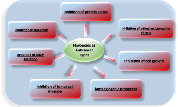 Флавоноиды могут подавлять канцерогенез и развитие опухолей с помощью разных механизмов действия (противовоспалительное и др.). Например, флавоноиды Ольхи Alnus incána – рутин, кверцетин и гесперидин – обладают противовоспалительным действием. Флавоноиды Вереска Calluna vulgaris обладают выраженной антиоксидантной активностью.
