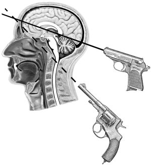 Но вернемся к почерку. Дело в том, что выстрел в голову, в мозг, как правило, смертелен, хотя у этого правила есть и поразительные исключения. Смерть даже от сквозного прострела мозга не обязательна и, что в данном случае главное, наступает не сразу, а через несколько минут. В бою это не имеет значения – солдату главное попасть, а через какое время уже обезвреженный противник умрет, неважно. Поэтому, если казнью занимается любитель, которому к тому же наплевать на муки казнимого, то любитель будет стрелять прямо в заднюю часть головы, в череп – так удобнее, так быстрее и не надо выворачивать руку с пистолетом.