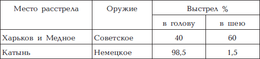 Таким образом, безусловным почерком палачей НКВД был выстрел в шею – в первый шейный позвонок. И именно такой выстрел отметила следственная бригада ГВП в Харькове и Медном, причем в Харькове они эксгумировали останки на кладбище, где безусловно хоронились преступники, расстрелянные НКВД, а не немцами. А до Медного немцы вообще не дошли. Нынешние геббельсовцы дали нам и число – 60 % выстрелов в шею были безусловным почерком НКВД. А в 1943 г. немцы, эксгумируя тела поляков в Катыни, тоже сделали данное исследование и зафиксировали число91. Давайте теперь численные данные сведем в табличку и посмотрим, что получится.